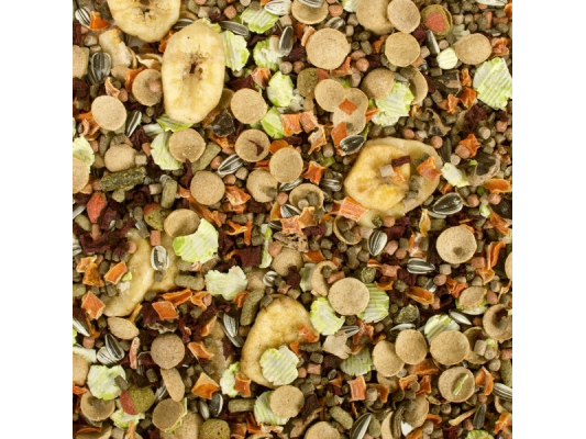 Céréales (dont maïs), sous-produits végétaux (dont granulés d'herbe 9,5%, menthe, camomille, persil, granulés de luzerne 4%, fleurs de souci, foin 2%), fruits (pommes séchées contenues dans les granulés 11%, légumes (betteraves séchées 3%, carottes séchées 3%), graines (dont graines de lin contenues dans les granulés 1,5%, graines de tournesol contenues dans les granulés 1,5%), minéraux (zéolite 1%). Additifs : colorants. Constituants analytiques : protéines brutes 12,0%, matières grasses brutes 2,8%, cellulose brute 14,0%, humidité 11,0%.