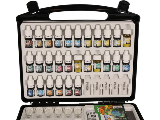 coffret en plastique étanche comprenant 6 éprouvettes en verre, 2 seringues, des cuillères doseuses, un thermomètre, un stylo et des feuilles pour inscrire les résultats