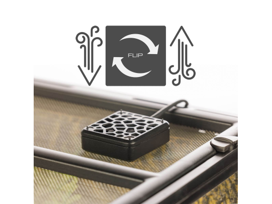 Le mini-ventilateur Exo Terra® est un ventilateur silencieux de 1W à basse tension qui améliore la circulation de l'air dans le terrarium, réduit l'air stagnant et empêche la condensation. Il favorise un air frais et sain pour les animaux et les plantes, protège contre les infections respiratoires et le stress thermique, et soutient une croissance vigoureuse des plantes. Avec une minuterie, il permet d'imiter le gradient naturel d'humidité entre la nuit et le jour – idéal en combinaison avec un humidificateur. Le ventilateur réduit l'humidité le matin, prévient la moisissure et élimine les odeurs désagréables. L'installation est simple : placez-le sur la grille du couvercle du réseau, sa position détermine la direction du flux d'air (entrant ou sortant). Le système à roulement à billes assure un fonctionnement silencieux et fiable. Un adaptateur secteur n'est pas inclus.
