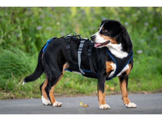 Les sangles de taille sont ajustées très lâchement pour offrir au chien le meilleur confort possible. Ainsi, le chien peut porter le harnais toute la journée sans restriction et peut être soutenu à tout moment lorsqu'il se lève, monte des escaliers, etc.
