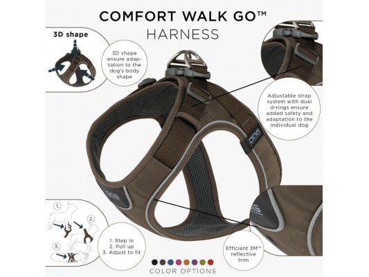 Le harnais Comfort Walk GoTM de DOG Copenhagen est un harnais marchepied confortable et léger conçu pour les chiens de petite et moyenne taille. Fabriqué à partir de matériaux durables résistants aux taches et à l'eau avec un rembourrage doux et respirant. Le harnais est facile à utiliser et confortable à porter pour le chien pendant tous les niveaux d'exercice. Les sangles réglables, le grand panneau velcro et la forme 3D assurent des promenades sûres et une adaptation à la forme corporelle du chien individuel.