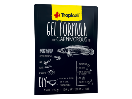 GEL FORMULE CARNIVORE est une poudre à haute teneur en invertébrés (24,2 %) à mélanger pour préparer une nourriture gélifiée pour poissons omnivores et carnivores.