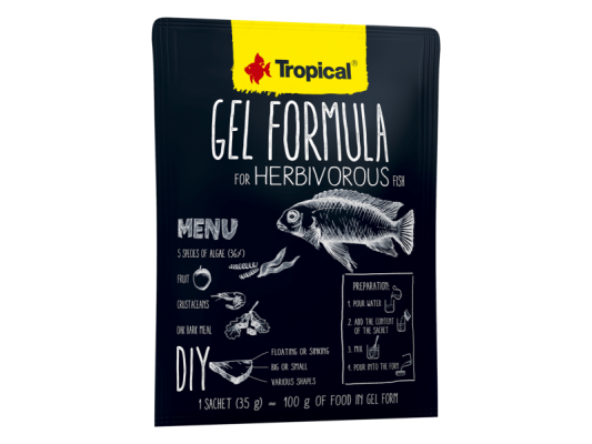 GEL FORMULE HERBIVORE est une poudre à haute teneur en algues (36 %) à mélanger pour préparer une nourriture gélifiée pour poissons herbivores et omnivores.