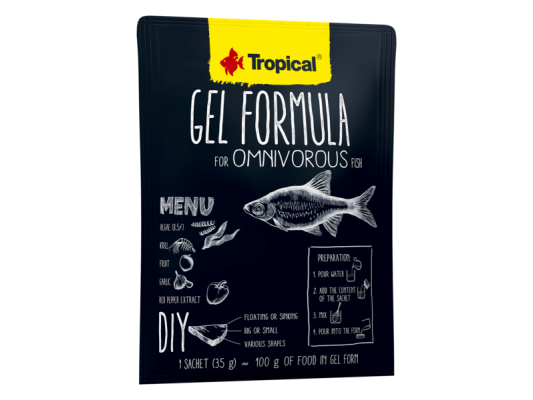 GEL FORMULE OMNIVOROUS est une poudre à base d'algues, de krill et de fruits à mélanger pour créer une nourriture gélifiée pour poissons omnivores.
